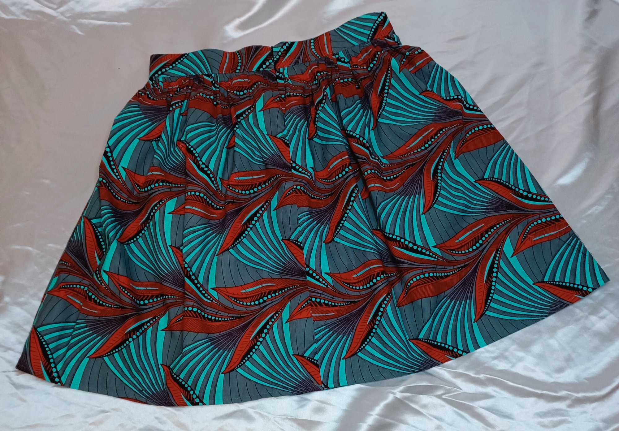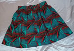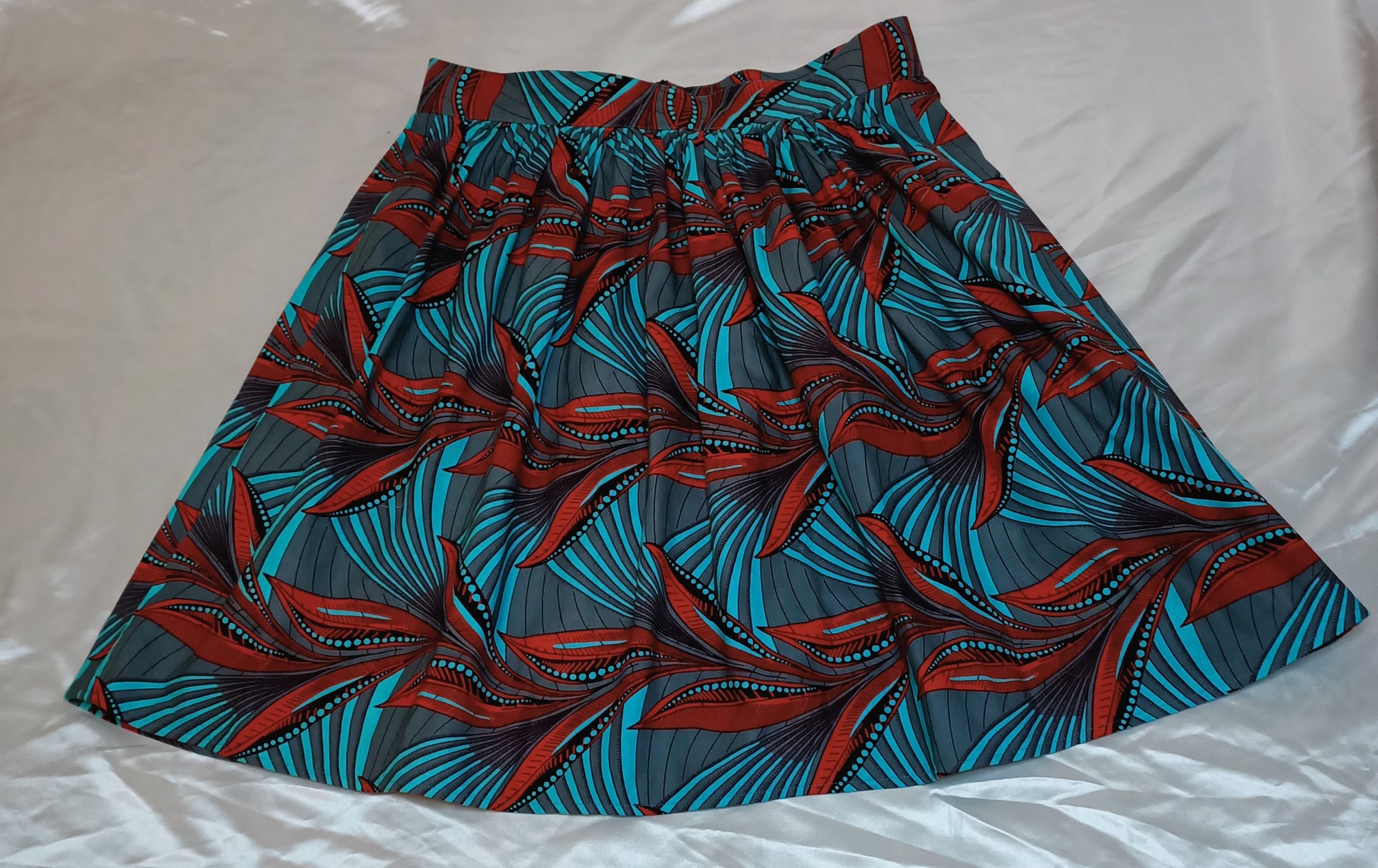Vibrant blue and red African cloth gathered at the waist skirt.