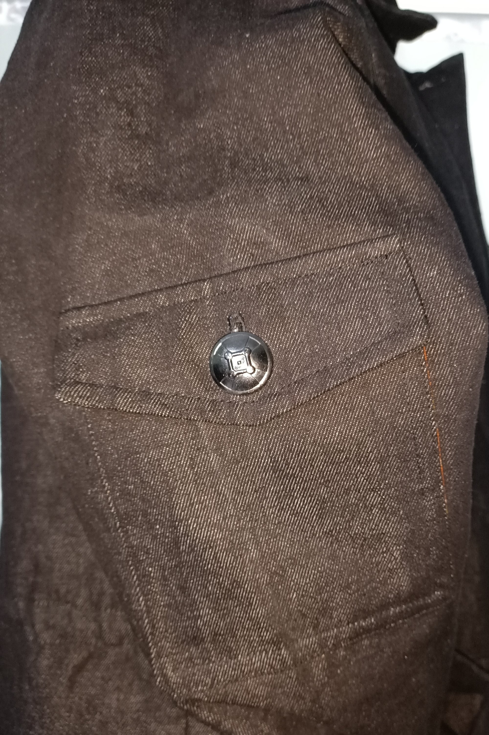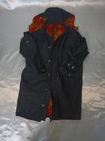Black denim coat with a lining of African pop art gold and green stars for men and women.
