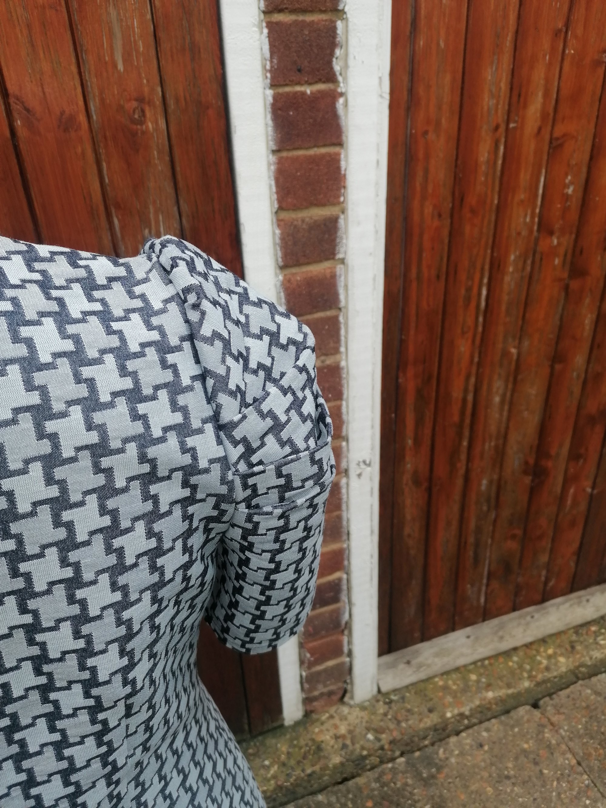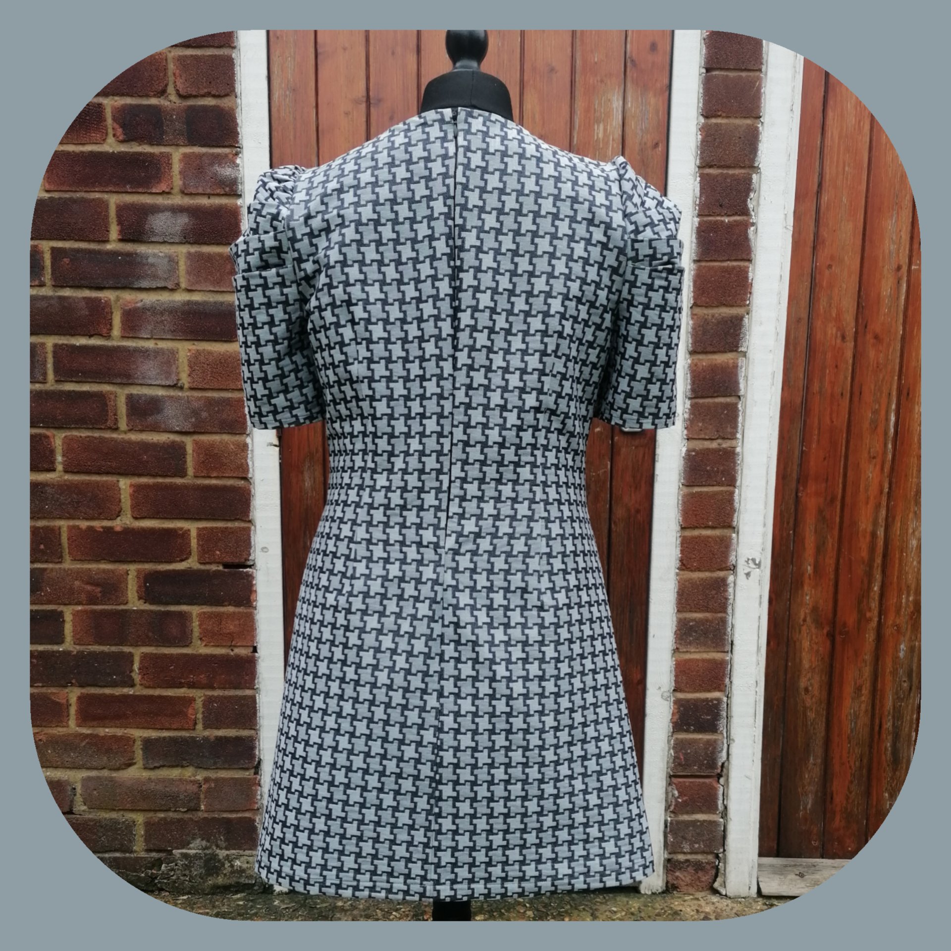 Short puffy pleated sleeves in keeping with the current trend carried over from 2020. Back invisible zip fastening with hook and eye.
